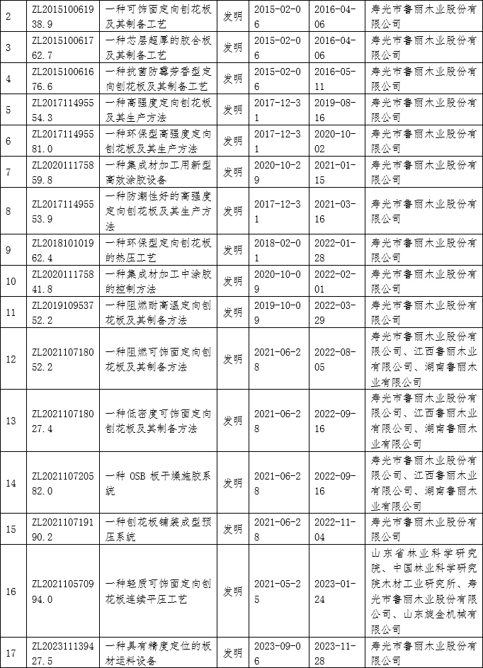科技獎(jiǎng)勵(lì):21項(xiàng)(其中中國專利優(yōu)秀獎(jiǎng)2項(xiàng),山東省科技進(jìn)步三等獎(jiǎng)1項(xiàng),梁希林業(yè)科學(xué)技術(shù)獎(jiǎng)二等獎(jiǎng)1項(xiàng),濰坊市科技進(jìn)步二等獎(jiǎng),濰坊市專利獎(jiǎng)一等獎(jiǎng)1項(xiàng)、二等獎(jiǎng)2項(xiàng)、 三等獎(jiǎng)1項(xiàng),中國木材與木制品行業(yè)專利獎(jiǎng)金獎(jiǎng)2項(xiàng),中國木業(yè)科技獎(jiǎng)特等獎(jiǎng)1項(xiàng),中國建材與家居行業(yè)科學(xué)技術(shù)獎(jiǎng)二等獎(jiǎng)2項(xiàng),木材保護(hù)工業(yè)協(xié)會科技進(jìn)步二等獎(jiǎng)2項(xiàng), 中國林業(yè)產(chǎn)業(yè)創(chuàng)新獎(jiǎng)(人造板業(yè))三等獎(jiǎng)1項(xiàng),中國林業(yè)科學(xué)研究院重大科技成果獎(jiǎng)1項(xiàng),山東省優(yōu)秀企業(yè)創(chuàng)新成果一等獎(jiǎng)2項(xiàng),山東省企業(yè)技術(shù)創(chuàng)新優(yōu)秀成果優(yōu)秀獎(jiǎng)2項(xiàng))