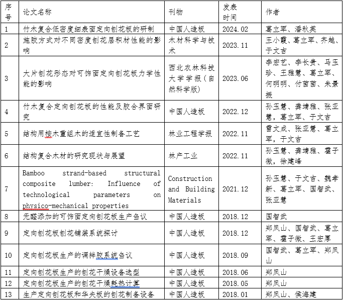 論文發(fā)表:13篇(其中SCI論文1篇,《林業(yè)工程學(xué)報(bào)》1篇,《林產(chǎn)工業(yè)》1篇,《木材科學(xué)與技術(shù)》1篇,《西北農(nóng)林科技大學(xué)學(xué)報(bào)》1篇,《中國人造板》8篇)